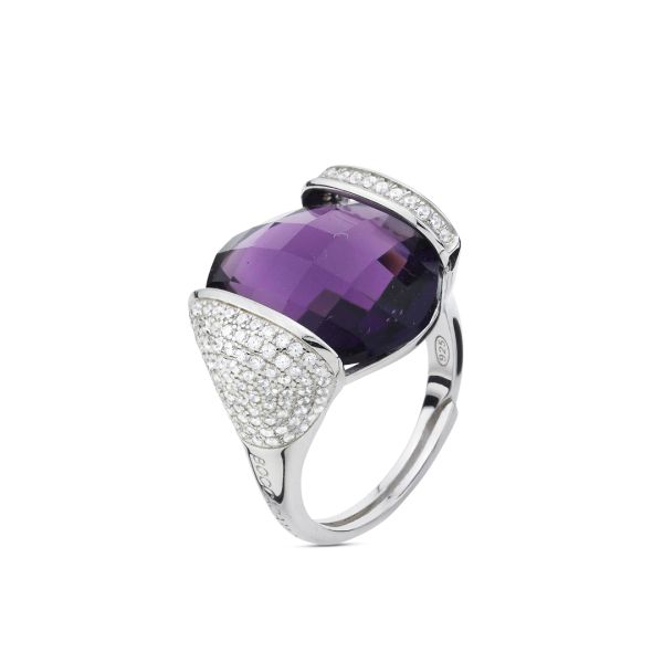 Anello da donna di Bottega Boccadamo della collezione Zoe. Anello rodiato con cristallo color ametista da 14 mm racchiuso in un doppio pavè di zirconi. Gioiello con due anni di garanzia.
