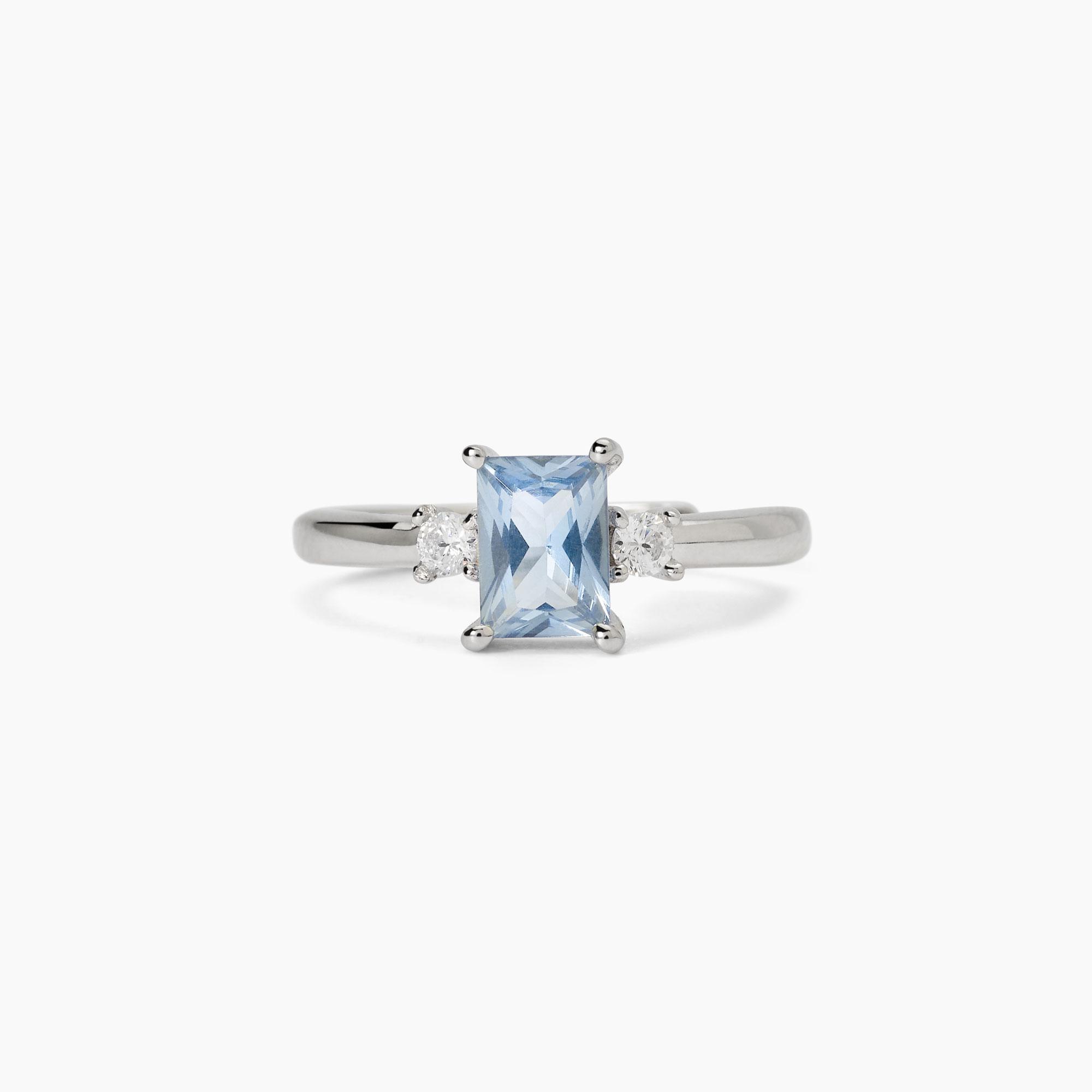 Anello da donna regolabile in argento rodiato con acquamarina sintetica taglio princess e zirconi bianchi.