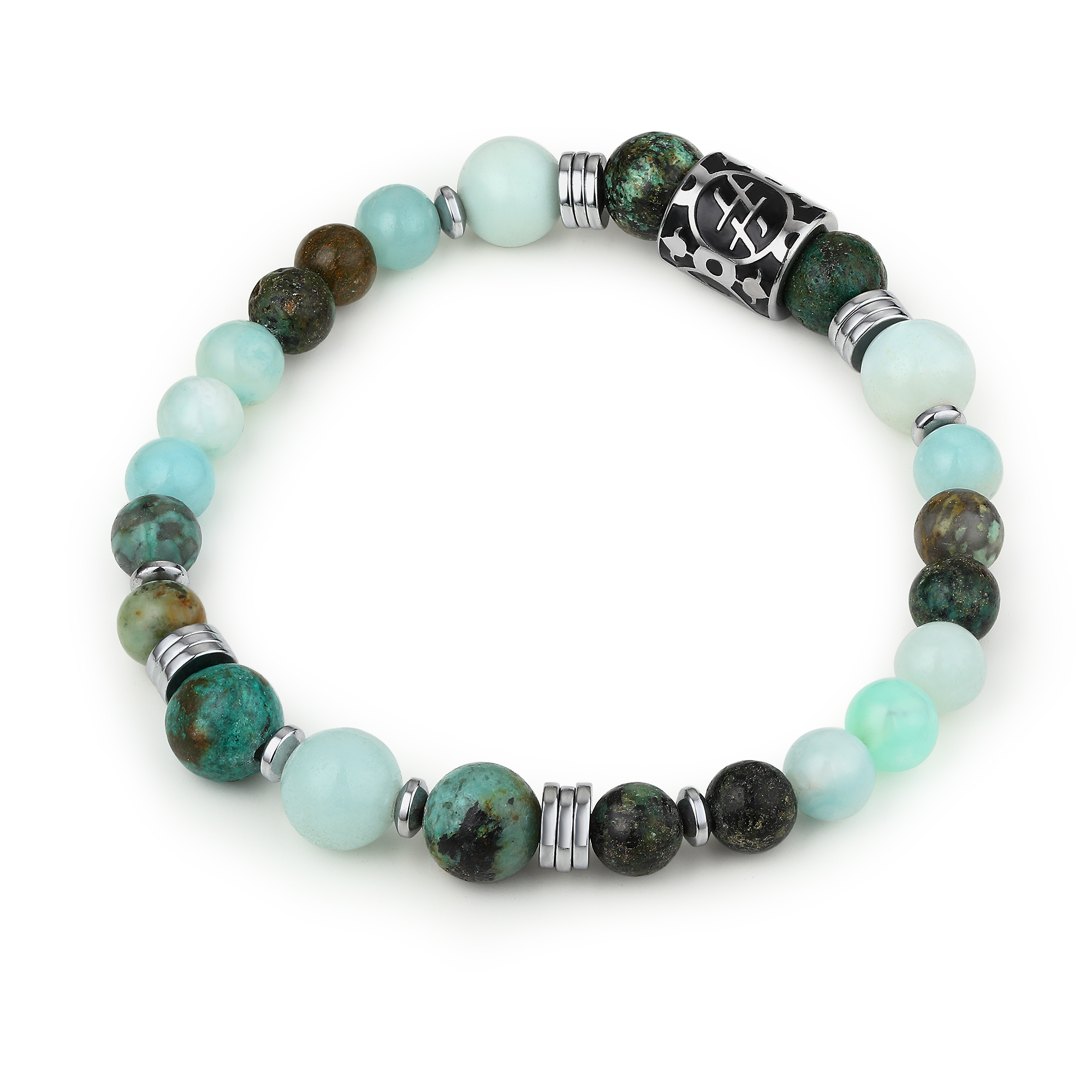Materiale: amazonite e turchese africano, acciaio inossidabile e dischetti in ematite