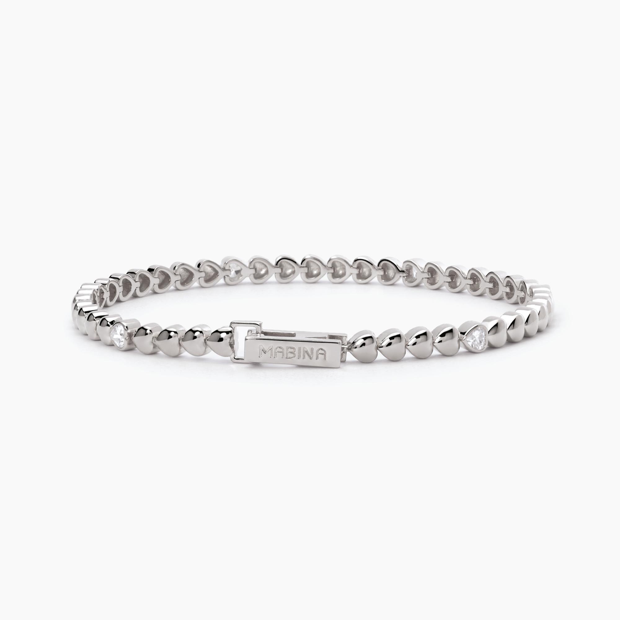 Bracciale tennis con cuori lucidi in argento alternati a pietre taglio cuore.