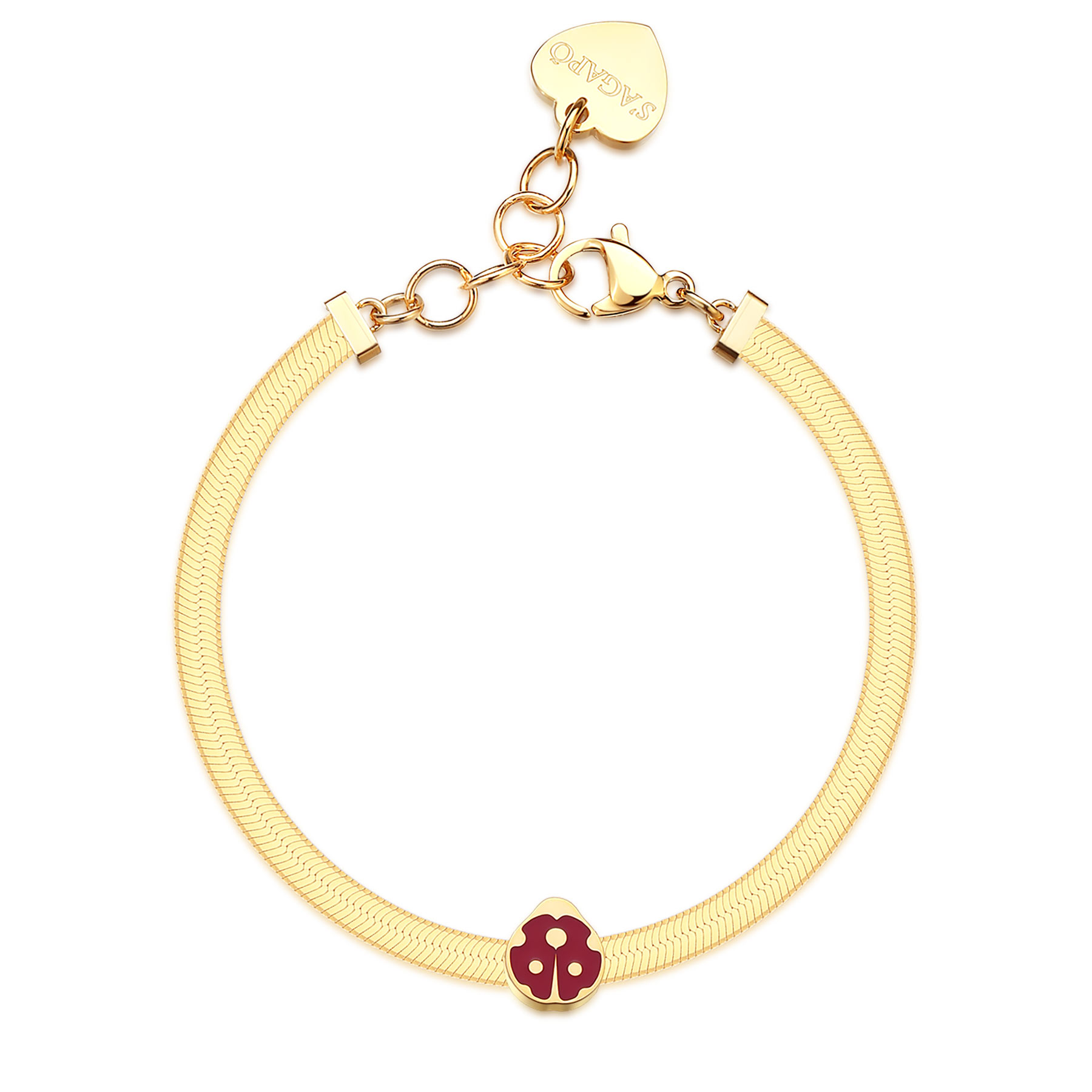 Bracciale catena snake in acciaio 316L e finitura pvd oro 14K con coccinella e smalto rosso.