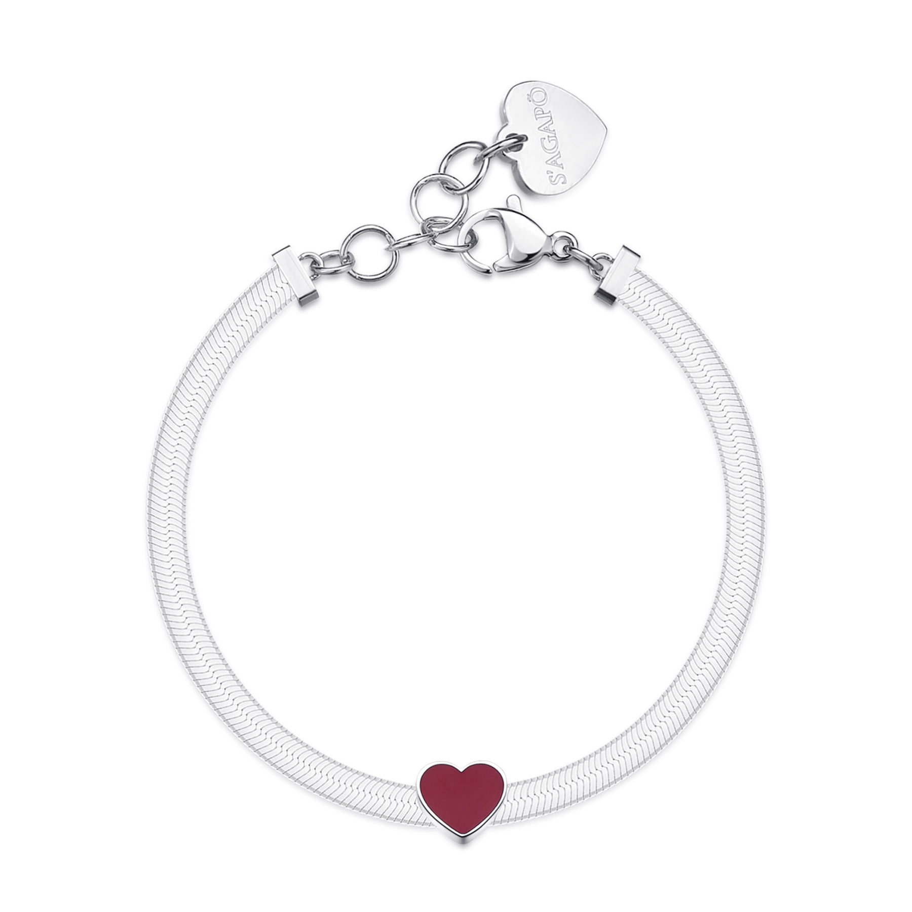 Bracciale catena snake in acciaio 316L con cuore e smalto rosso.