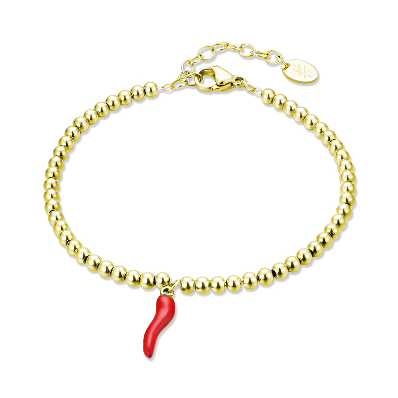Bracciale donna a pallini con cornetto rosso smaltato portafortuna.Pensato per chi desidera portare sempre con sé un simbolo di buona fortuna senza rinunciare a stile e femminilità.Bracciale realizzato interamente in acciao 316L nella versione dorata. Bracciale con due anni di garanzia ufficiale.