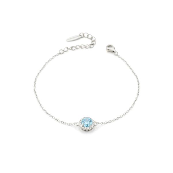 Bracciale rodiato con cristallo centrale di colore acquamarina circondato da zirconi bianchi.