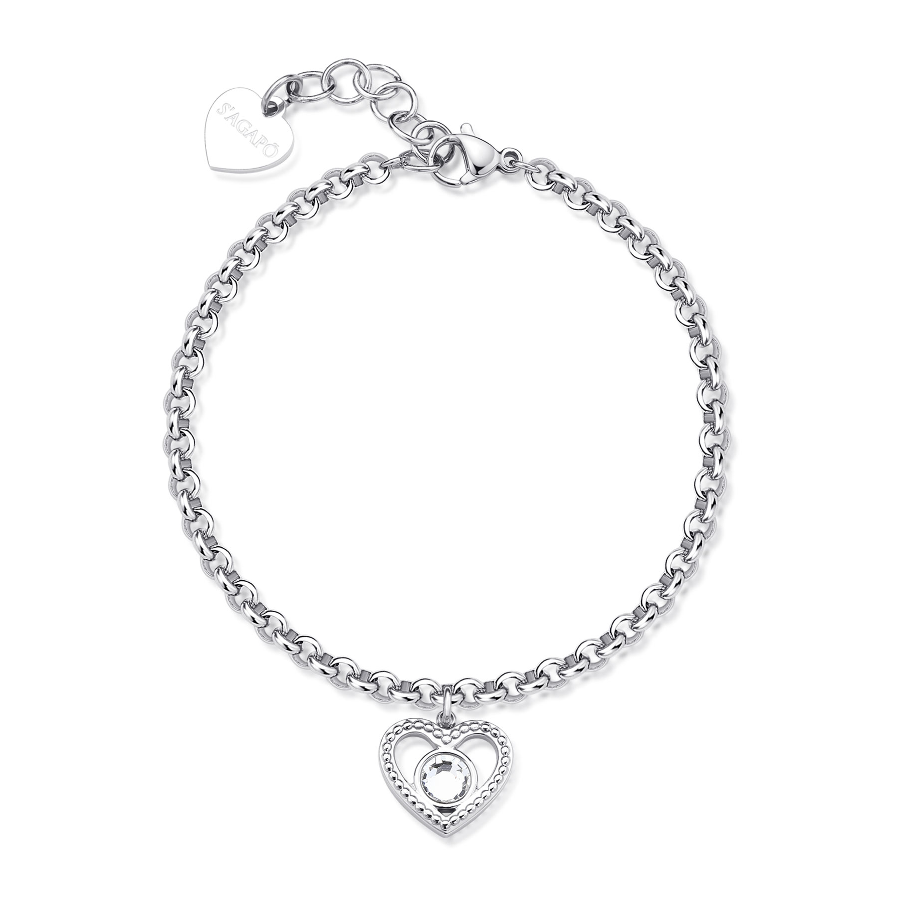 Bracciale in acciaio 316L con pendente a forma di cuore e cristallo.