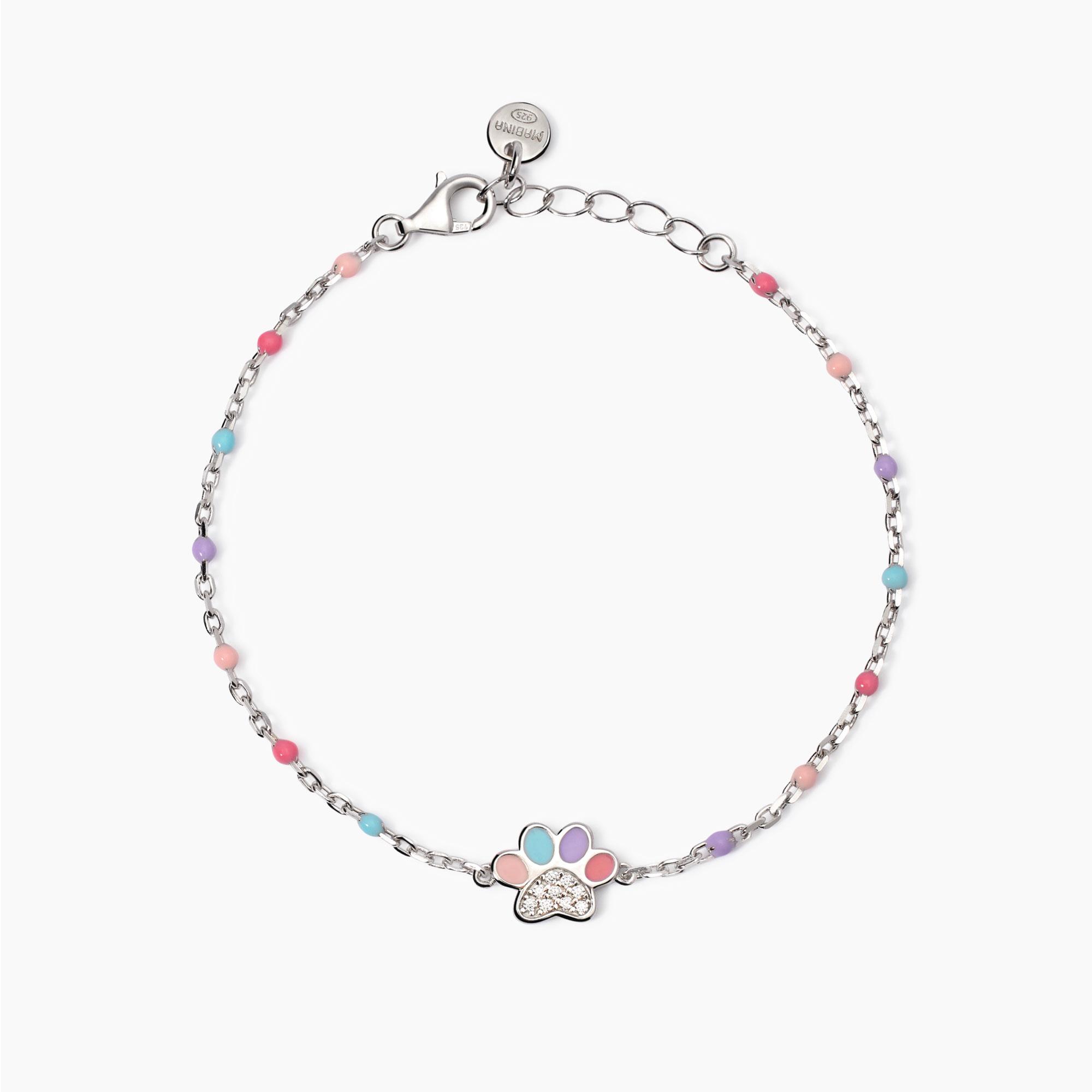Bracciale regolabile da bambina in argento rodiato con inserti smaltati, catena forzatina e zampina centrale smaltata con zirconi.