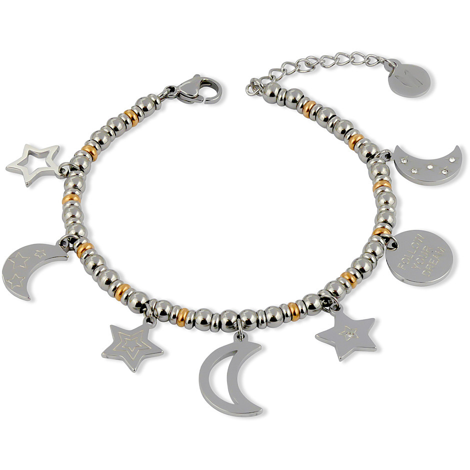 Bracciale Da Donna Di Boccadamo Della Collezione Piccoli Tesori Della Linea Mya. Bracciale A Sfere Bicolor In Acciaio 316L Con Charms A Forma Di Stella E Luna. Lunghezza Regolabile Da Cm 16,5 A Cm 19,5. Chiusura: Con Moschettone. La Referenza È Pi/Br85