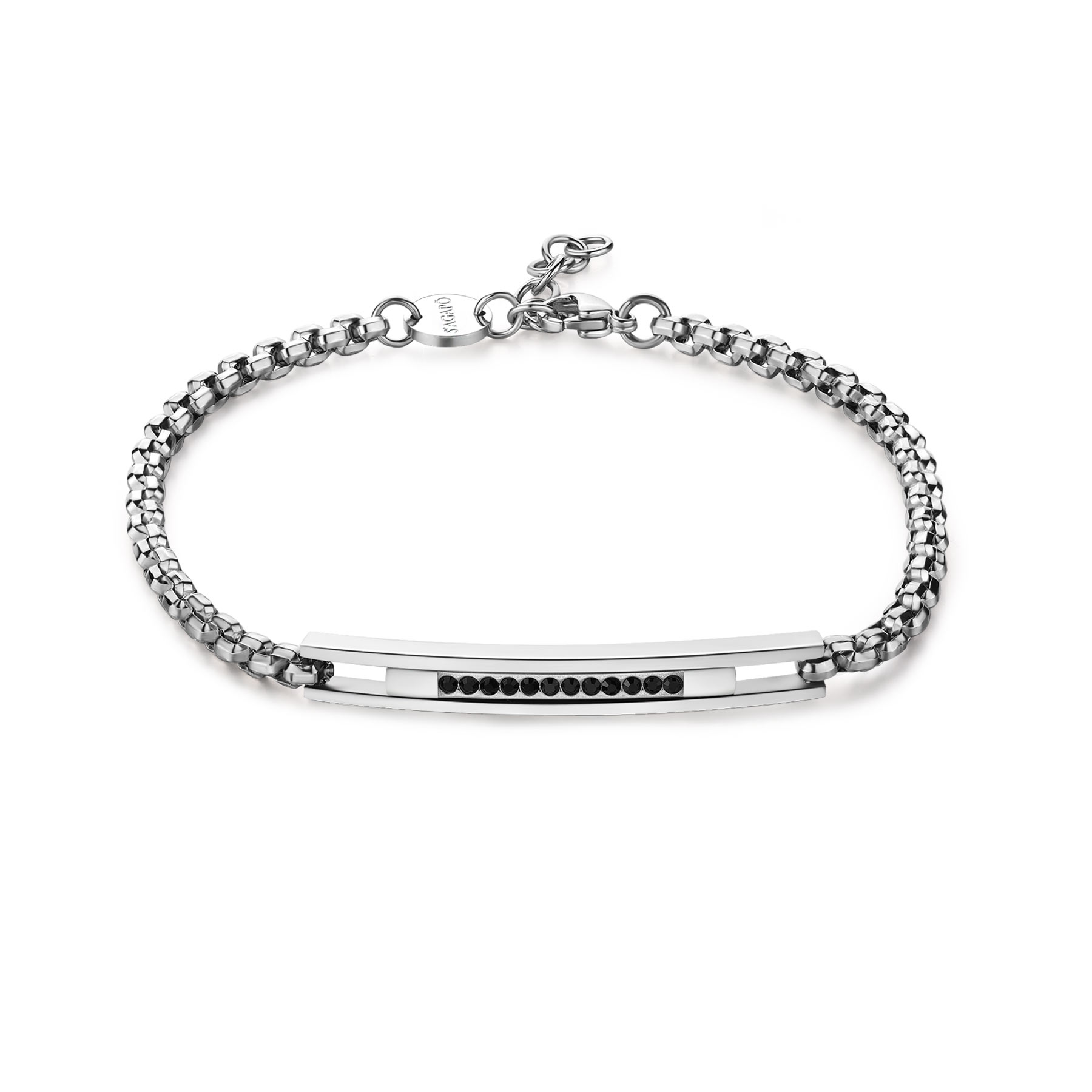 Bracciale in acciaio 316L con catena rolò quadrata e centrale con cristalli neri.