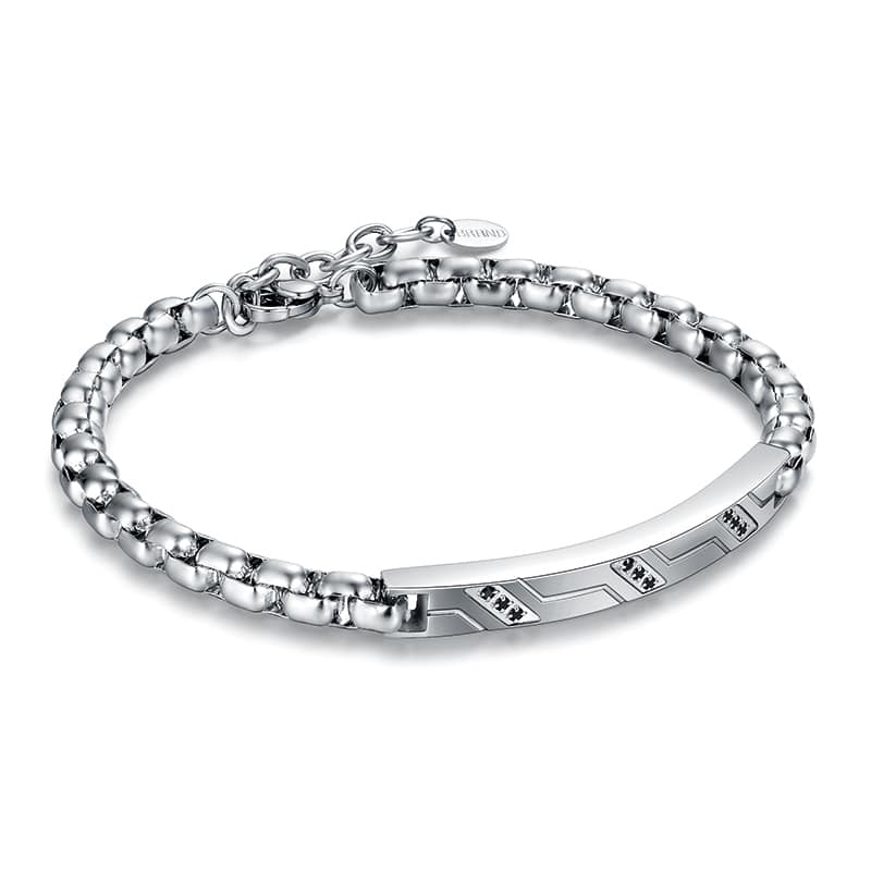 Bracciale con targa e cristalli neri, realizzati in acciaio ipoallergenico e inossidabile. Il bracciale ha una lunghezza di 19 cm + 3 cm di estensione.Gioiello con due anni di garanzia ufficiale bRand Gioielli.