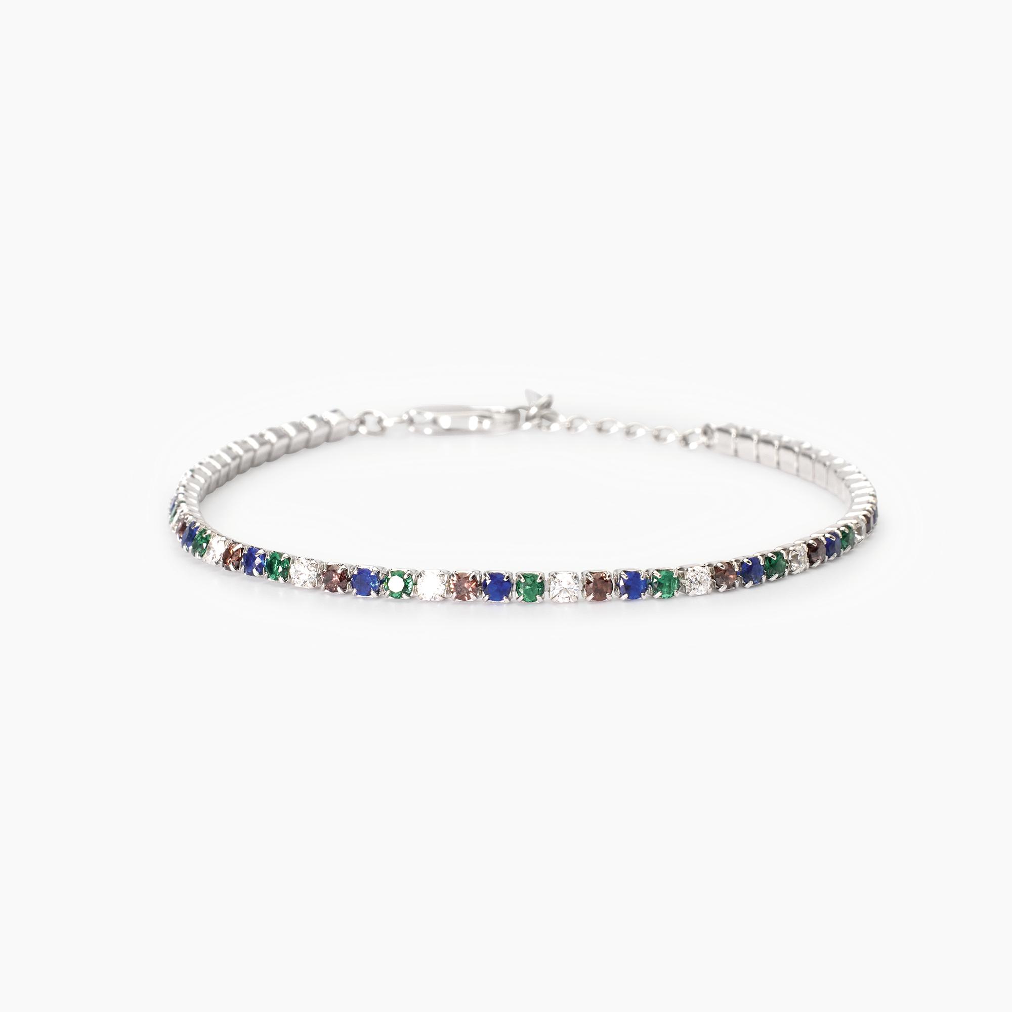 Bracciale tennis regolabile da uomo in argento rodiato con smeraldi e zaffiri sintetici, zirconi bianchi e zirconi marroni.