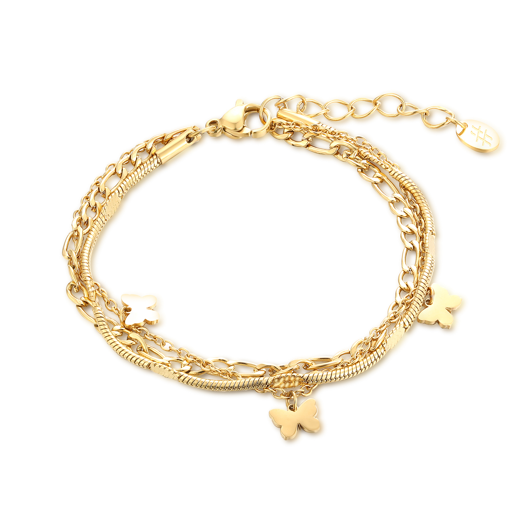 Bracciale triplo filo con farfalle pendenti.