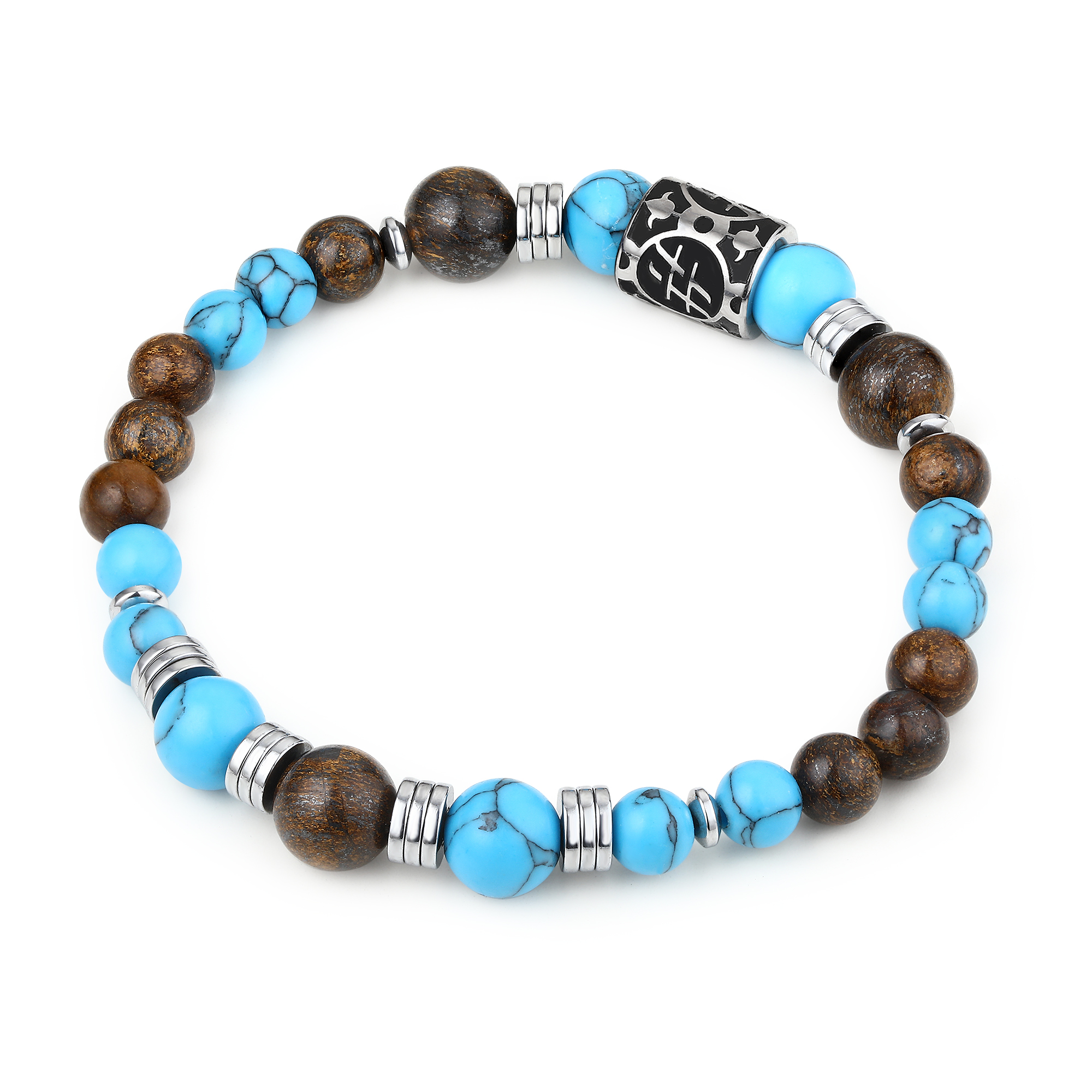 Materiale: turchese e bronzite, acciaio inossidabile e dischetti in ematite