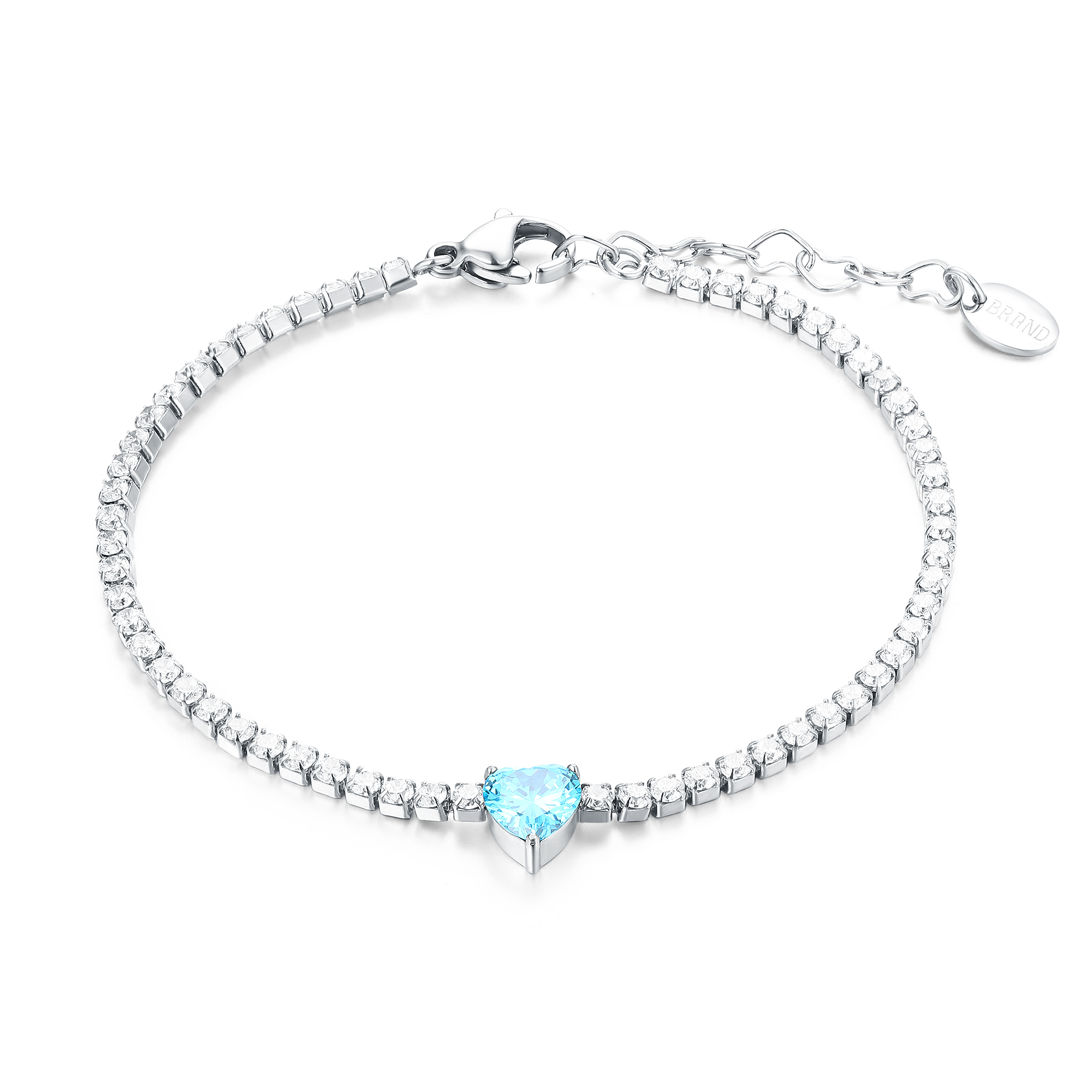 Bracciale tennis 2mm con cristallo a forma di cuore azzurro.