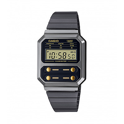 Orologio Digitale Da Donna Di Casio Della Collezione Vintage. Orologio Con Cassa In Resina Grigio Di Diametro 32,7 Mm, Display Digitale, E Chiusura Regolabile In Acciaio Ip Scuro. La Resistenza All’Acqua E’ (Wr) A Norma Iso 22810. Il Movimento È Al Quarzo. Le Funzioni Sono: Luce Led Cronometro – 1/10 Sec – 1 Ora, Allarme Giornaliero, Calendario Automatico. Vetro Acrilico, Bracciale In Acciaio Inox, 3 Anni – 1 Batteria. La Referenza È: A100Wegg-1A2Ef.