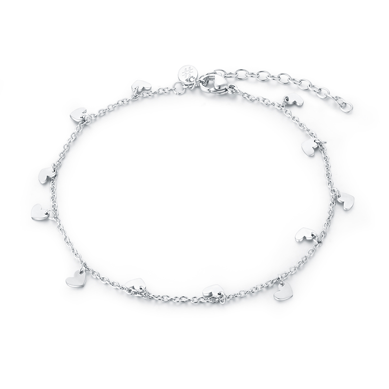 Cavigliera cuori pendenti da donna della collezione Calypso di Brand Gioielli, in acciaio 316L con lunghezza 21cm+5cm di estensione. Gioiello con due anni di garanzia ufficiale Brand Gioielli.