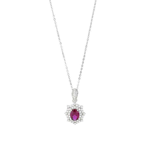 Collana rodiata con cristallo pendente ovale di colore rubino con cornice esagonale di zirconi bianchi