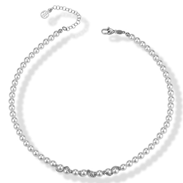 Collana con perle bianche ed elemento decorativo centrale a spirale in argento.