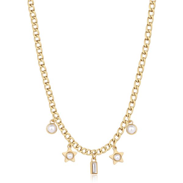 Collana girocollo in acciaio 316L e finitura pvd oro 14K con pendenti a forma di stella, perle e cristallo.