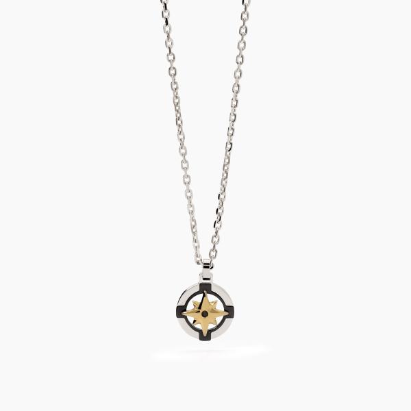 Collana in acciaio 316L con catena forzatina 2 mm e pendente rosa dei venti lucido con PVD giallo e gunmetal Ø 14 mm con cristallo nero Ø 1.5 mm, lunghezza regolabile da 45 a 50 cm