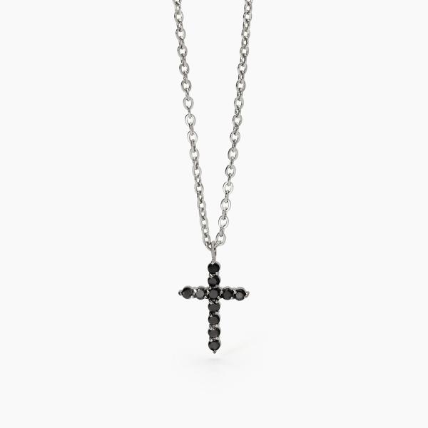 Collana in acciaio 316L con catena forzatina 2 mm, pendente croce 20×15 mm con zirconi neri Ø 2.5 mm, lunghezza 50 cm