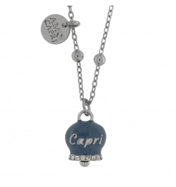 Campanella pendente con smalto blu cobalto, scritta “capri” in rilievo e cristalli bianchi.
