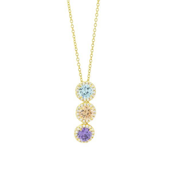 Collana placcata oro giallo con fila di tre cristalli pendenti di colore acquamarina, pesca, tanzanite circondati da zirconi bianchi.