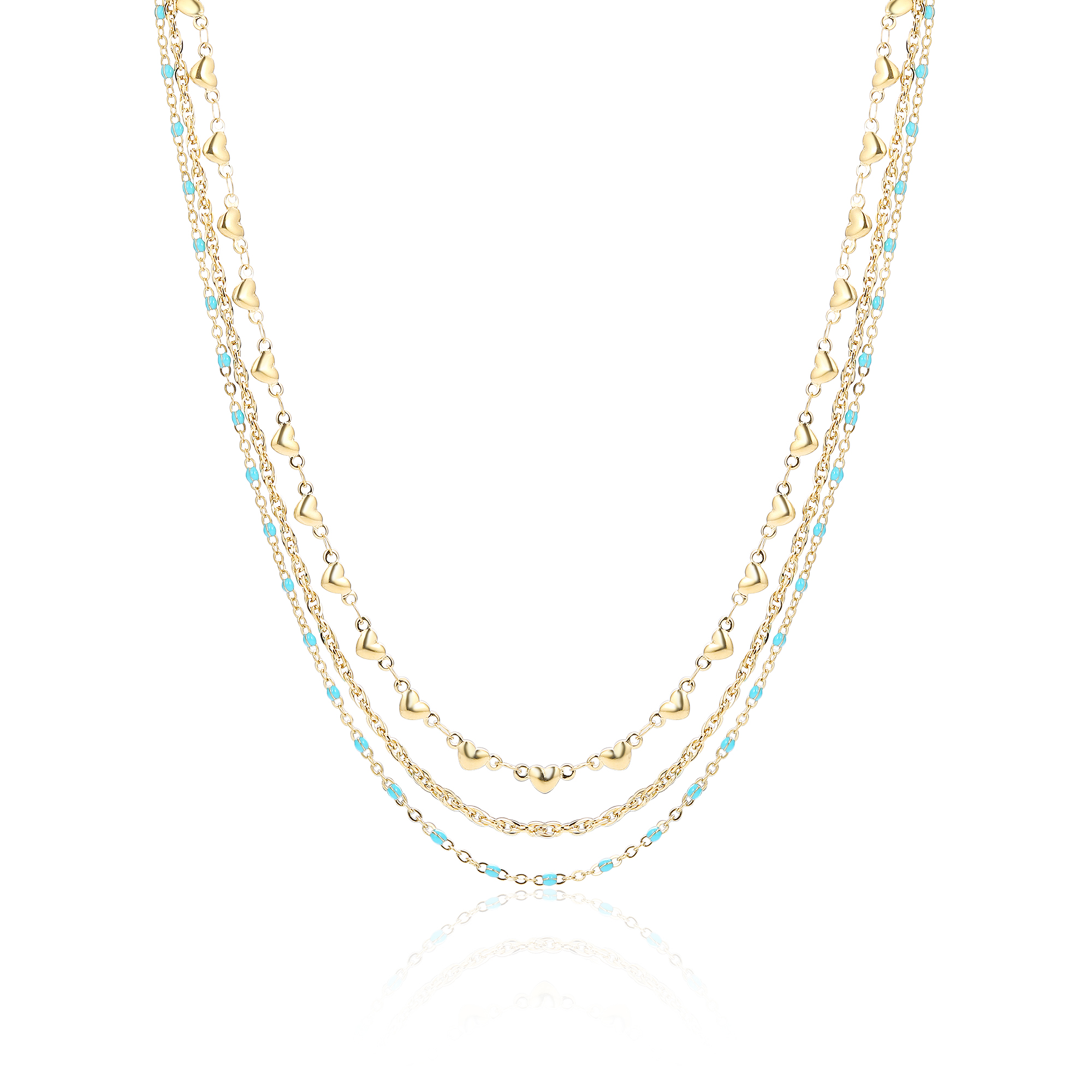 Collana triplo filo con gocce di smalto turchese e catena a cuori