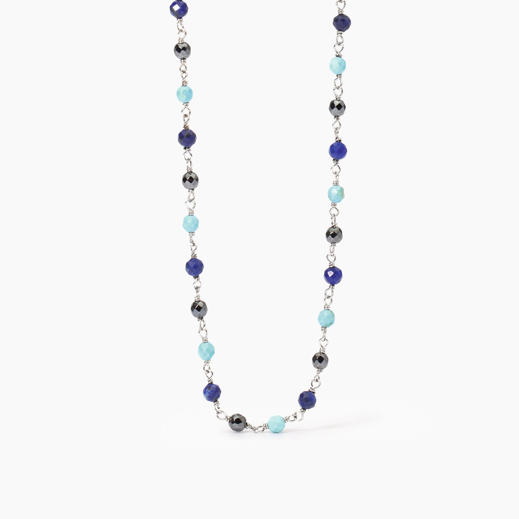 Collana regolabile da uomo in argento rodiato con ematite, lapis e turchese faccettati.