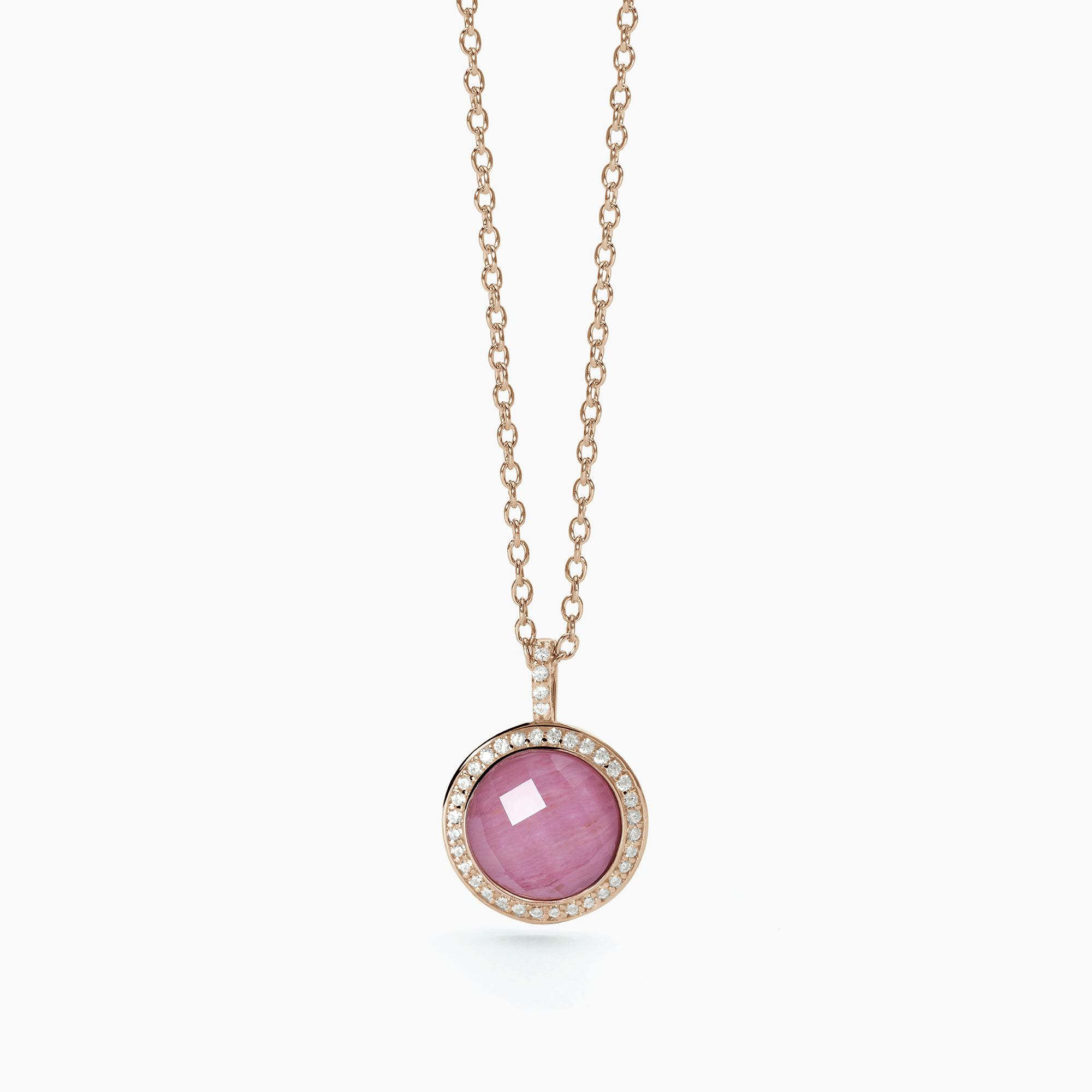 Girocollo da donna in argento placcato oro rosa 18k con catena forzatina, cabochon doublet sfaccettato rodocrosite, cristallo di rocca e zirconi bianchi.
