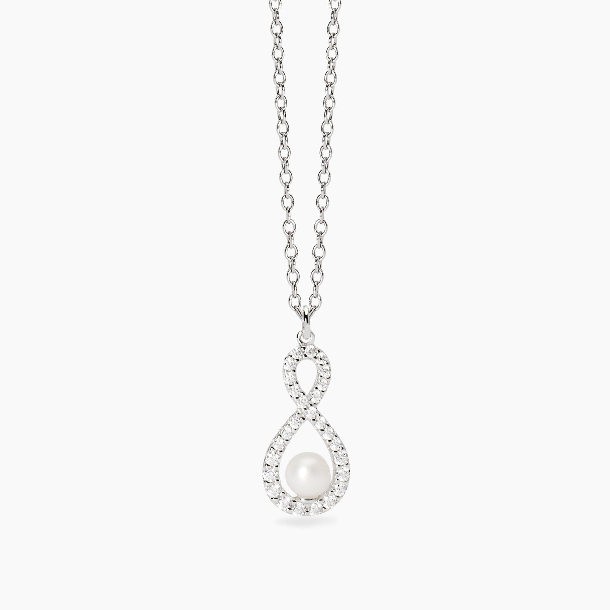 Girocollo in argento con catena rolò e pendente forma infinito in zirconi e perla coltivata.