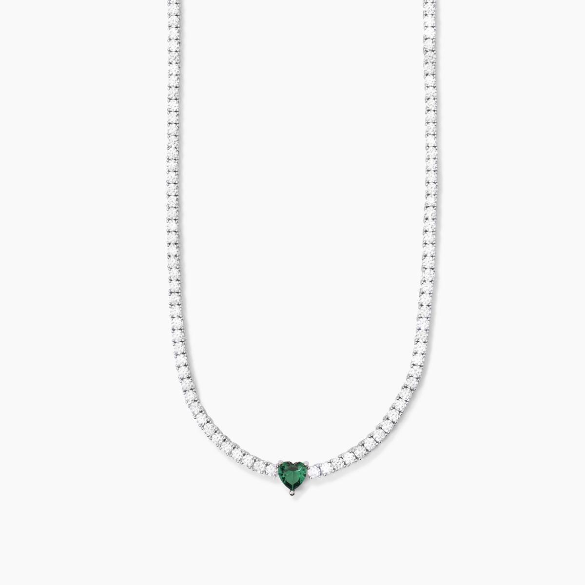 Girocollo tennis regolabile da donna in argento rodiato con smeraldo sintetico taglio cuore e zirconi bianchi.