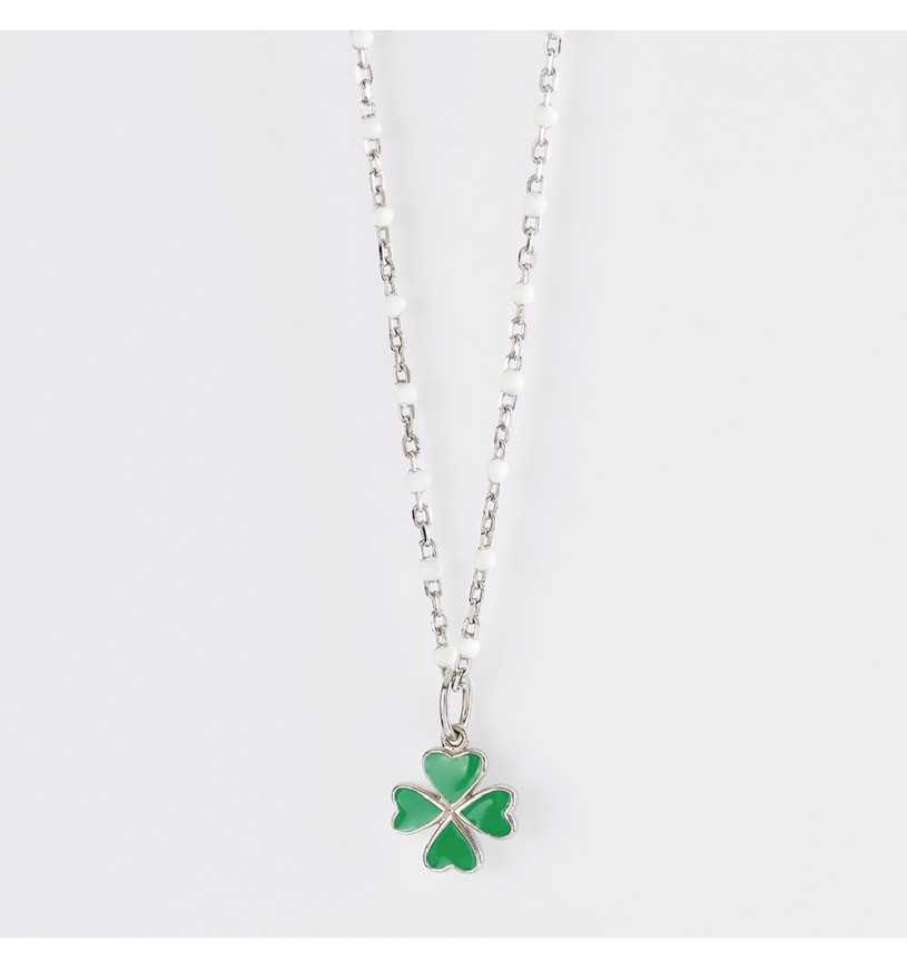 Collana da bimba realizzata inargento 925% con sfere bianche lungo la catenina e quadrifoglio smaltato pendente.