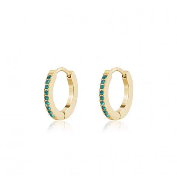 Orecchini a cerchio da donna realizzati in acciaio anallergico 316L con finitura dorata e impreziositi da cristalli verdi.