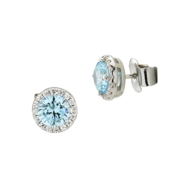 Orecchini rodiati con cristallo a forma circolare di colore acquamarina con cornice di zirconi bianchi.