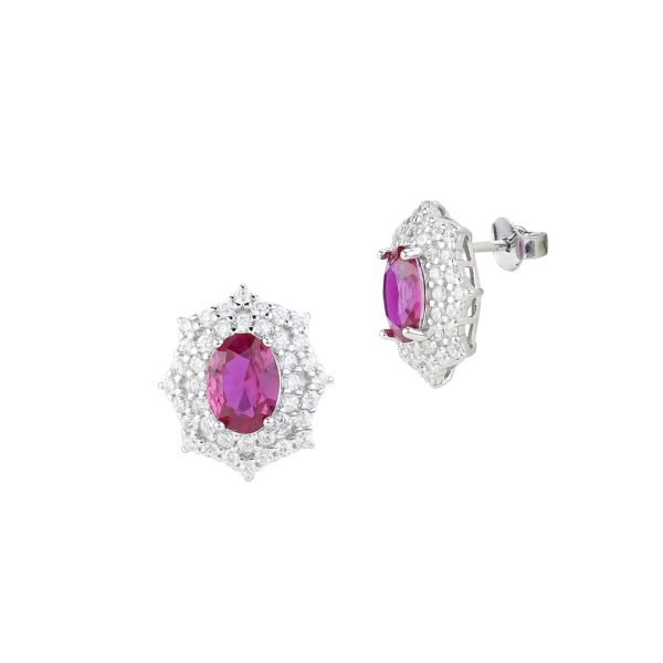 Orecchini rodiati con cristallo di colore rubino e corona di zirconi bianchi.