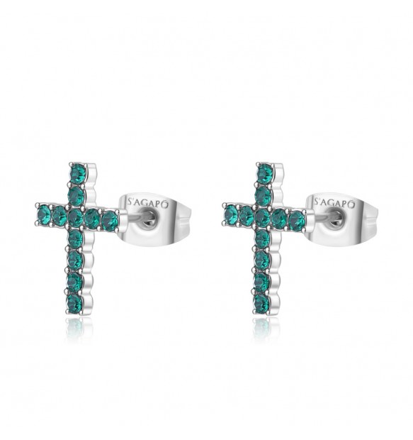 Orecchini a lobo da donna a forma di croce realizzati in acciaio anallergico 316L con finitura rodiata e impreziositi da cristalli verdi.