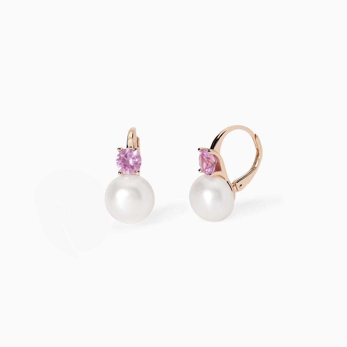 Orecchini da donna in argento placcato oro rosa 18K con tormalina rosa sintetica e perla bottone coltivata.