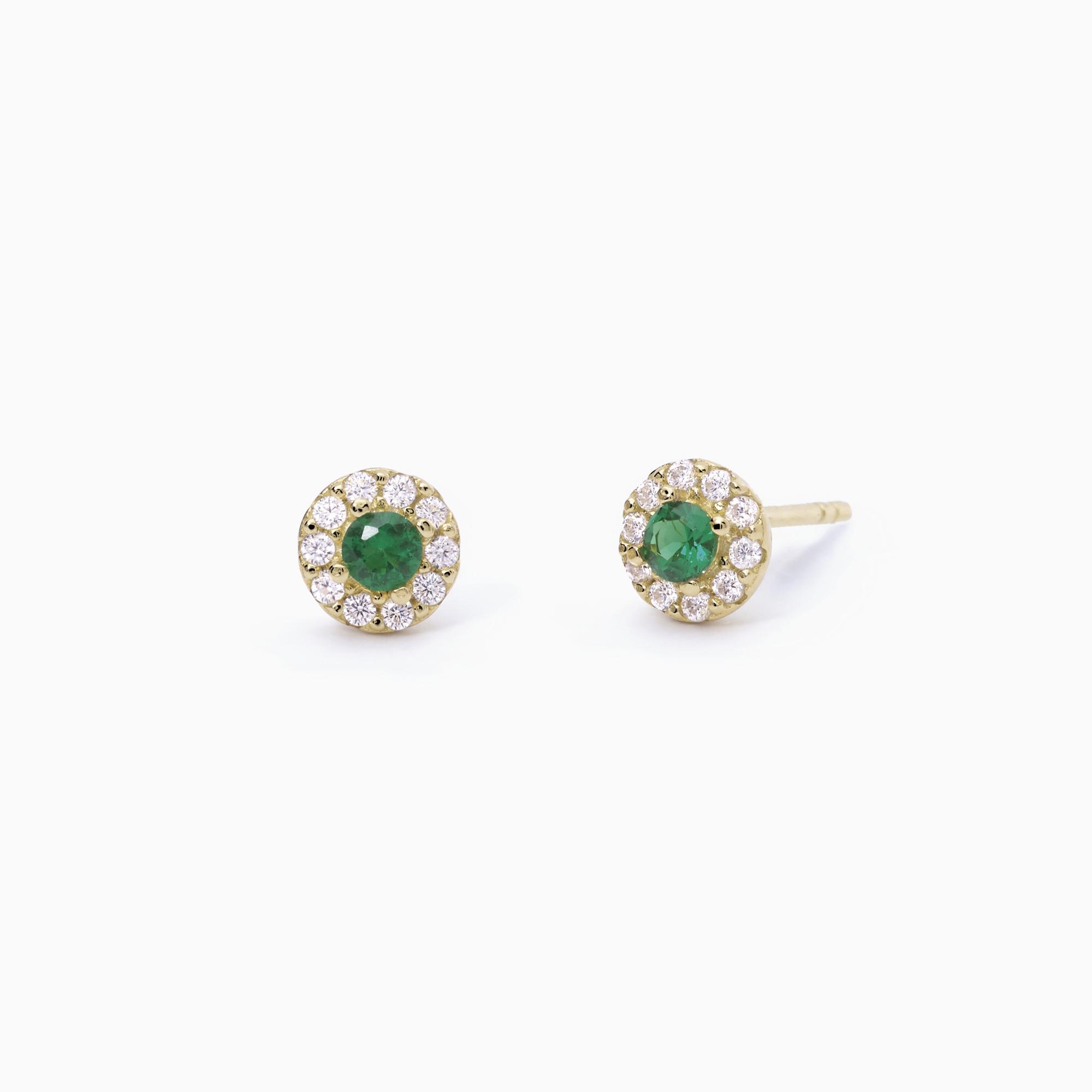 Orecchini a lobo in argento dorato con smeraldi sintetici circondati da zirconi bianchi.