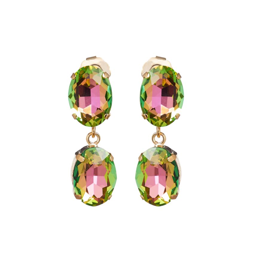 Orecchini pendenti dorati da donna Ottaviani, impreziositi da pietre con sfumature verdi e rosa.