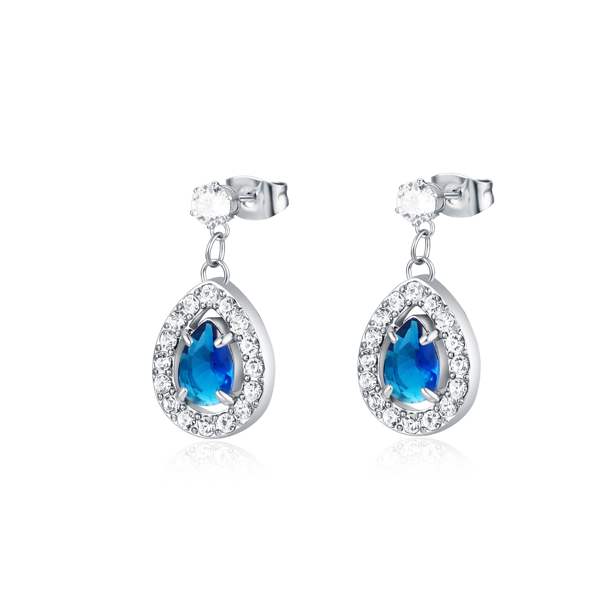 Orecchini punto luce bianco con cristallo goccia blu pendente
