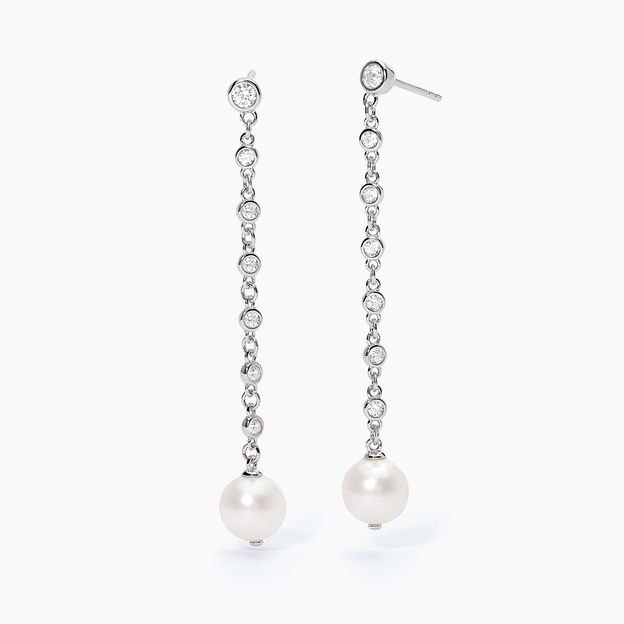 Orecchini pendenti Mabina Gioielli in argento 925 con sette zirconi bianchi incastonati a cipollotto e una perla vera coltivata bianca pendente.Il diametro dello zircone al lobo è di 3 mm, invece quello degli zirconi pendenti è di 2 mm. La perla ha un diametro di 8,5 /9 mm.Gli orecchini sono lunghi 5,5 cm.Chiusura con farfallina.